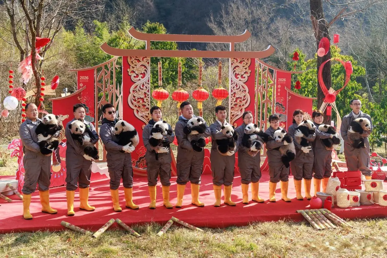 在中国大熊猫保护研究中心神树坪基地,饲养员带领2025级新生大熊猫幼崽亮相新春主题活动(2月5日摄)。新华社发(陈居伟 摄)