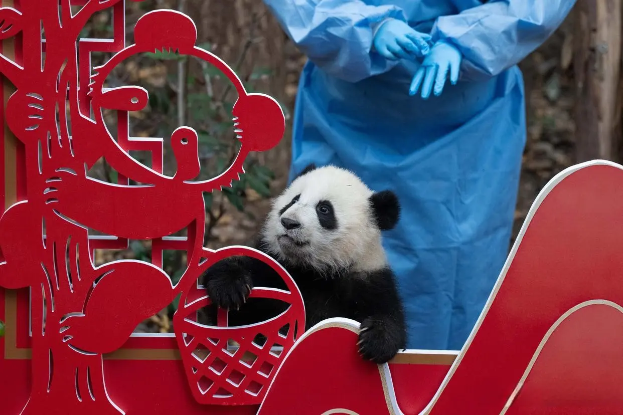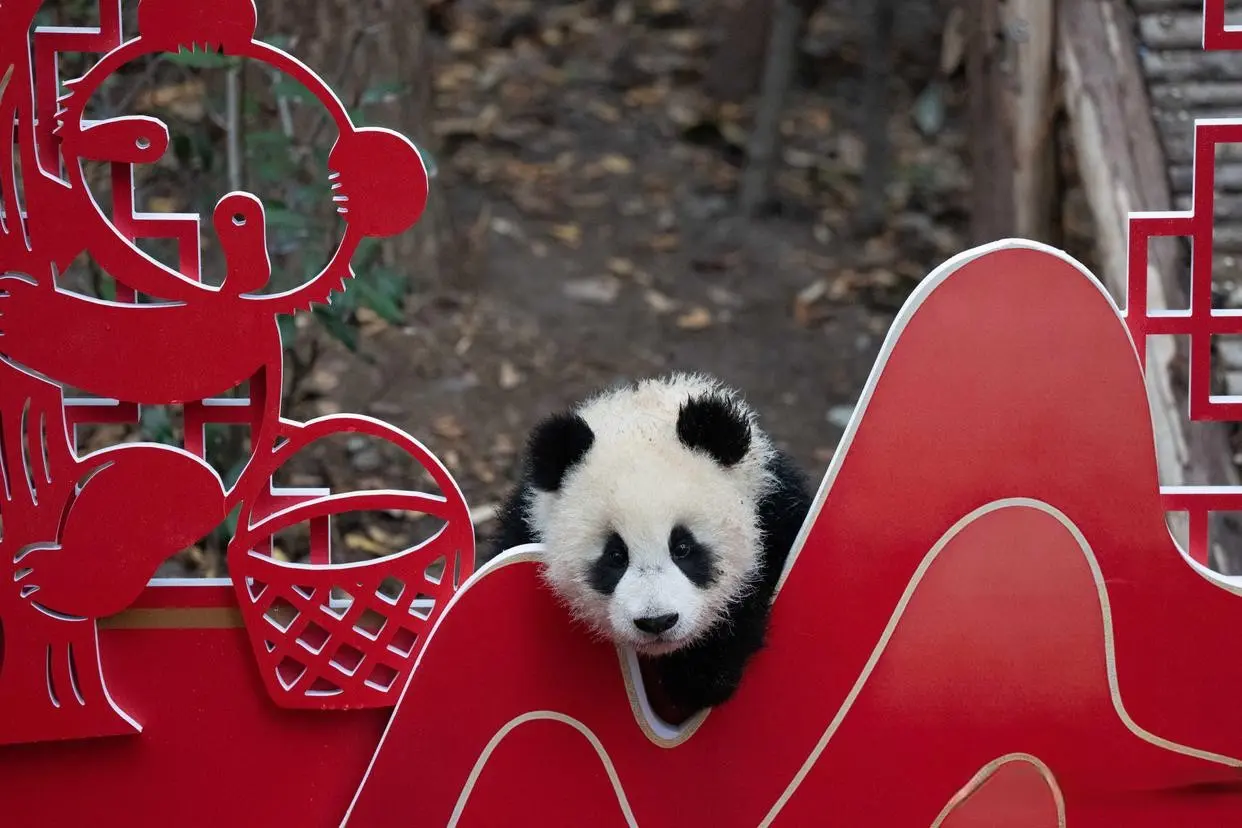 在中国大熊猫保护研究中心神树坪基地,2025级新生大熊猫幼崽亮相新春主题活动(2月5日摄)。新华社发(陈居伟 摄)