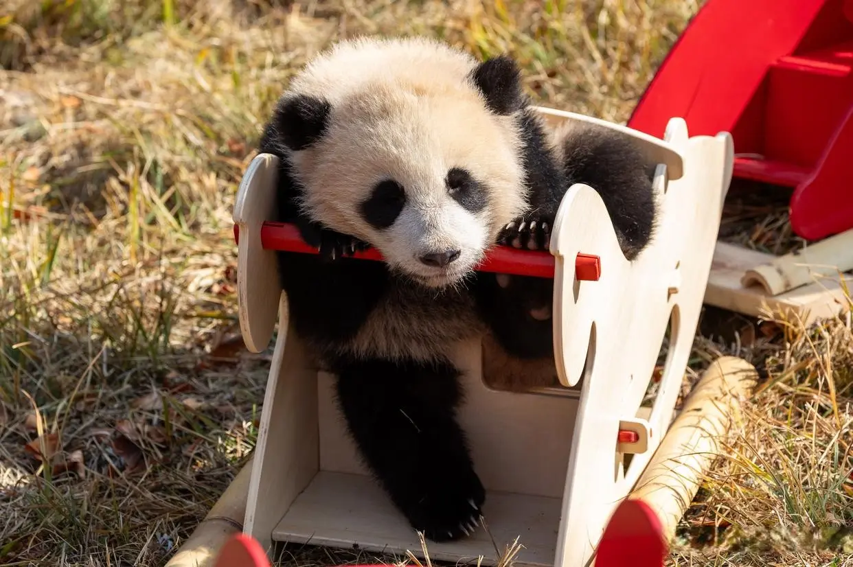 在中国大熊猫保护研究中心神树坪基地,2025级新生大熊猫幼崽在木马上玩耍(2月5日摄)。新华社发(陈居伟 摄)